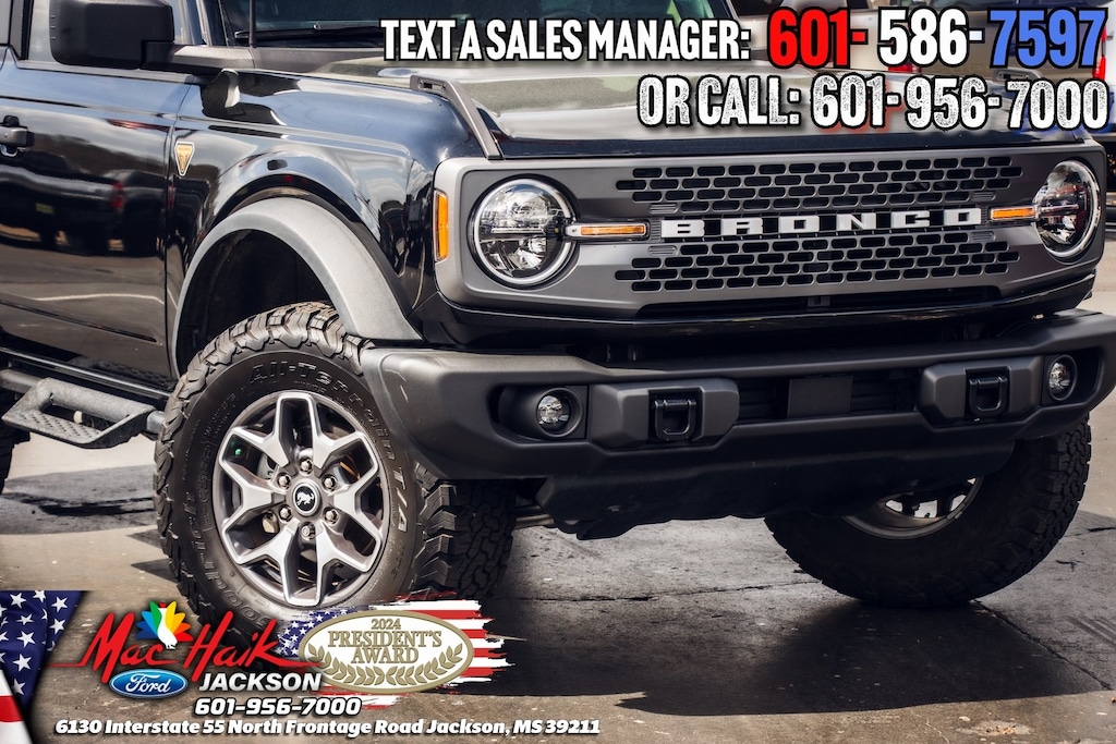 Shadow Black 2023 Ford Bronco Badlands 4WD 10-Speed Automatic 2.7L EcoBoost V6 Bronco Badlands, 2D Sport Utility, 2.7L EcoBoost V6, 10-Speed Automatic, Shadow Black, Black Onyx Vinyl, ABS brakes, Compass, Electronic Stability Control, Heated door mirrors, Illuminated entry, Low tire pressure warning, Remote keyless entry, Traction control.