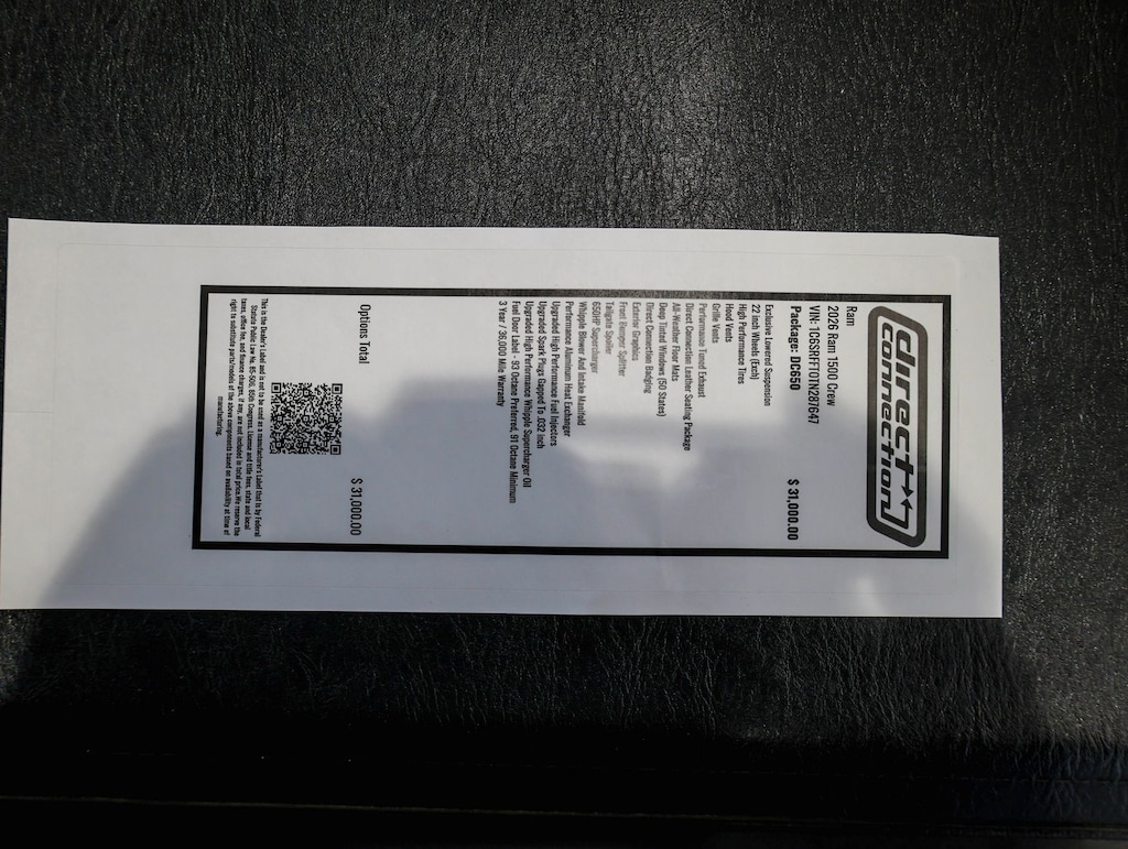 Diamond Black Crystal Pearlcoat 2026 Ram 1500 Direct Connection 650 Supercharged HEMI 4WD 8-Speed Automatic HEMI 5.7L V8 Multi Displacement VVT eTorque ABS brakes, Active Cruise Control, Alloy wheels, Compass, Electronic Stability Control, Heated door mirrors, Illuminated entry, Low tire pressure warning, Manual Folding Exterior Mirrors, ParkView Rear Back-Up Camera, Remote keyless entry, Traction control. Price includes: $3500 - 2026 National Retail Bonus Cash . Exp. 04/30/2026 $750 - 2026 Southwest BC Retail Bonus Cash . Exp. 04/30/2026