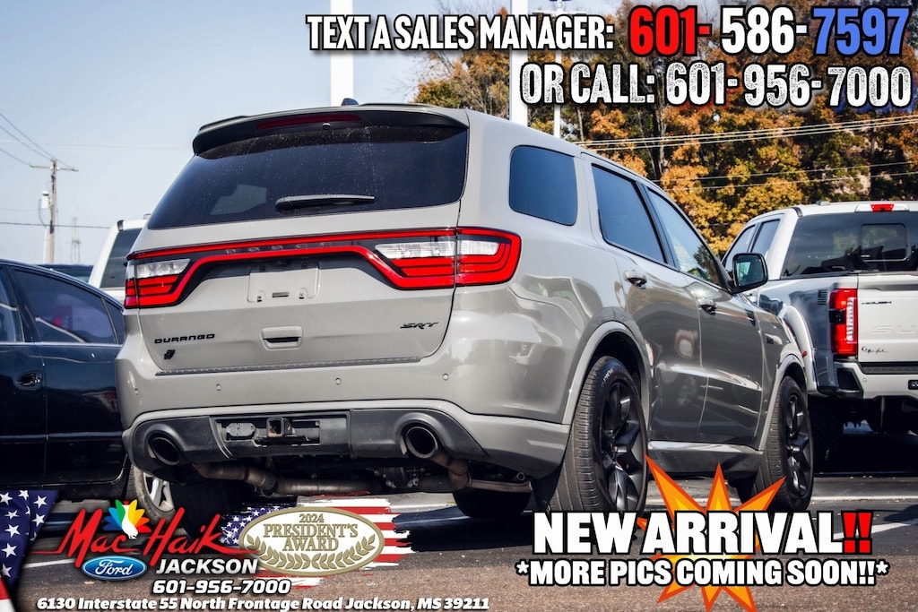 Destroyer Gray Clearcoat 2024 Dodge Durango SRT 392 AWD 8-Speed Automatic SRT HEMI 6.4L V8 MDS Durango SRT 392, 4D Sport Utility, SRT HEMI 6.4L V8 MDS, AWD, 3.70 Rear Axle Ratio, 3rd row seats: split-bench, 4-Wheel Disc Brakes, 7 & 4 Pin Wiring Harness, ABS brakes, Adaptive suspension, AM/FM radio: SiriusXM w/360L, Auto High-beam Headlights, Automatic temperature control, Black Package, Blind Spot w/Trailer Detection, Brake assist, Class IV Receiver Hitch, Eclipse Black Exhaust Tips, Electronic Stability Control, Four wheel independent suspension, Fully automatic headlights, Garage door transmitter, Gray Metallic Badges, Heated steering wheel, Leather Shift Knob, Leather steering wheel, Memory seat, Navigation system: TomTom, Outside temperature display, Overhead console, ParkView Rear Back-Up Camera, Power Liftgate, Quick Order Package 29L SRT 392, Radio: Uconnect 5 Nav w/10.1" Display, Satin Black Dodge Tail Lamp Badge, Speed-sensing steering, Speed-Sensitive Wipers, Steering wheel mounted audio controls, Trailer Brake Control, Trailer Tow Group IV, Wheels: 20" x 10" Lights Out Aluminum.